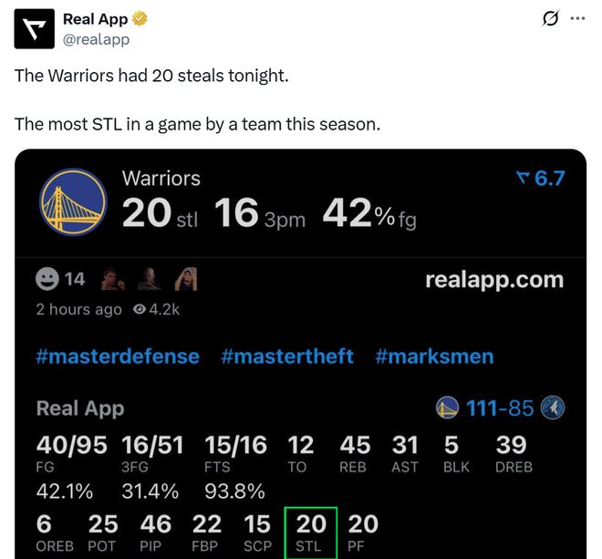 全場勇士隊一共送出多達20次搶斷,創造本賽季單場新高,其中首發庫里與波杰均送出4次搶斷,理查茲3次、追夢與桑托斯2次、霍福德、梅爾頓、波斯特、TJD、斯賓塞均有1次入賬。